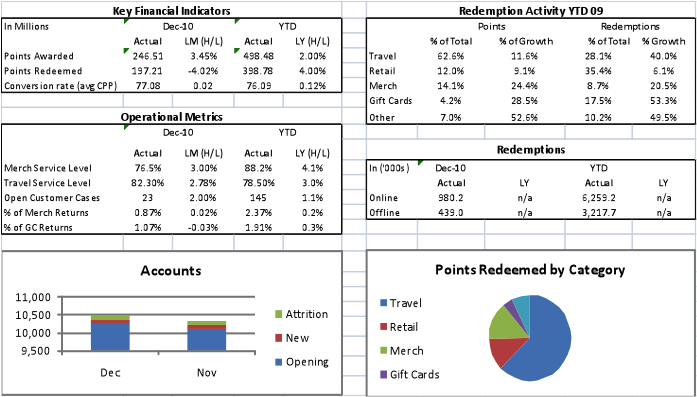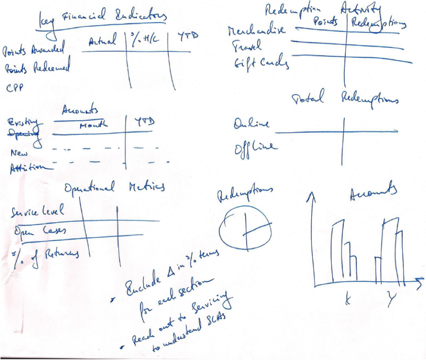 - Define the categories for each dashboard section (e.g. for reward redemption, the marketing executive may want the numbers broken out by Merchandise, Travel, Gift Card redemption)